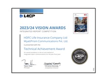 <p>HDFC Life's Integrated Annual Report won the Technical Achievement Award for overall excellence in the art and method of annual report communications for the last fiscal year at the LACP 2023/24 Vision Awards</p>